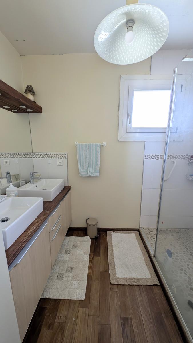 - rez-de-chaussée divisé en Entrée 3,40m², WC avec lave main, Cuisine équipée 11.40m², Salon-séjour 28m² ouvrant sur Terrasse bois avec store bane et Bain à remous (type Jacuzzi), Garage et Chaufferie,